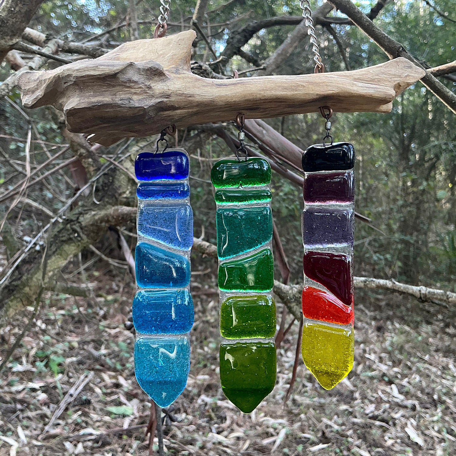Our rainbow wind chime brings joy and colour to any space. Each glass piece is hand-cut and kiln-fused for strength and shine. Every chime comes suspended from a unique piece of natural driftwood, finished with bees wax to adorn the set beautifully. Ready to hang, it adds gentle sounds and shimmering colour to gardens, patios, or windows.